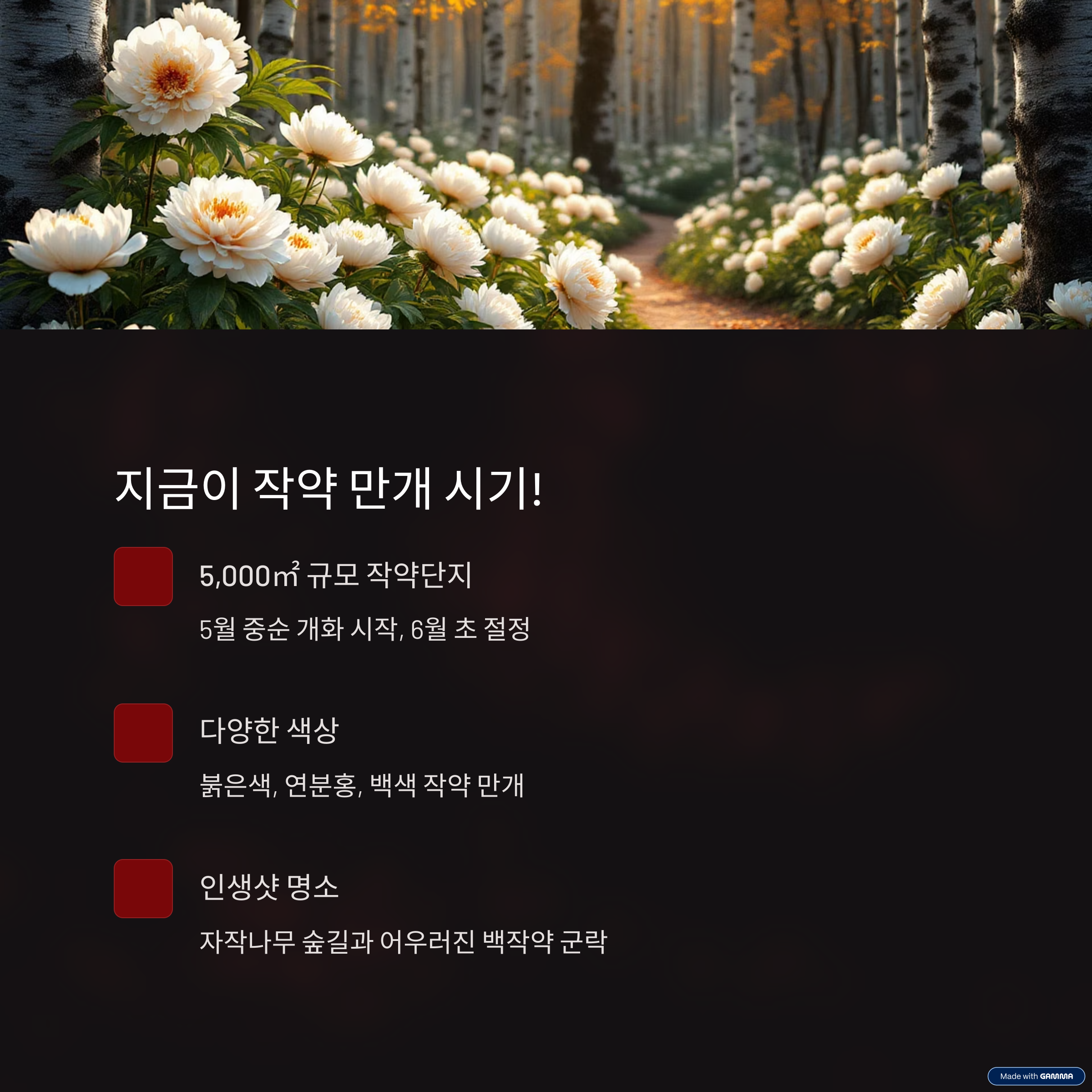 | 작약 개화 시기 | 5월 중순 개화 시작, 6월 초 만개 |