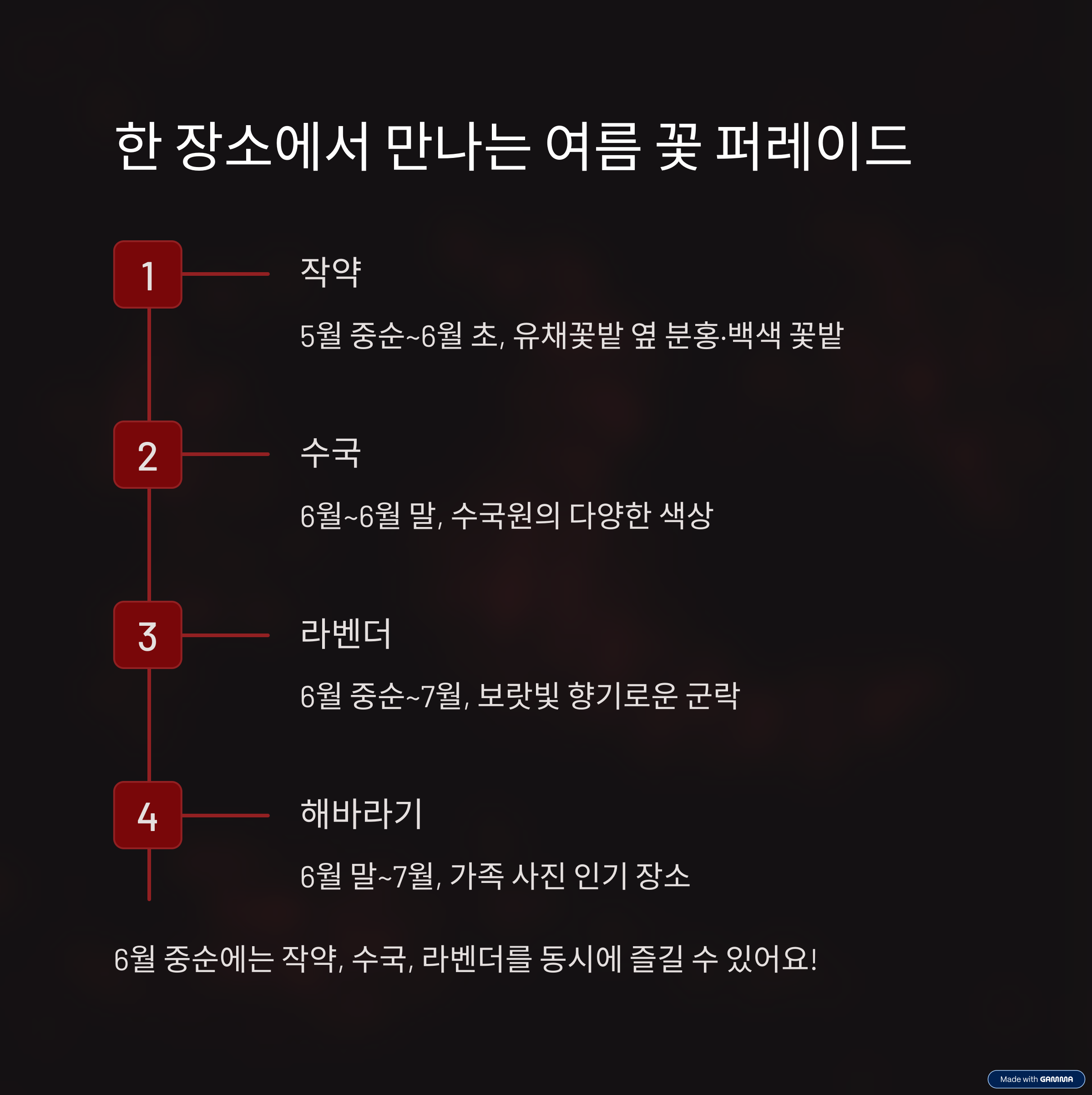 | 라벤더 | 6월 중순~7월 | 보랏빛 군락, 향기 좋은 사진 명소 |