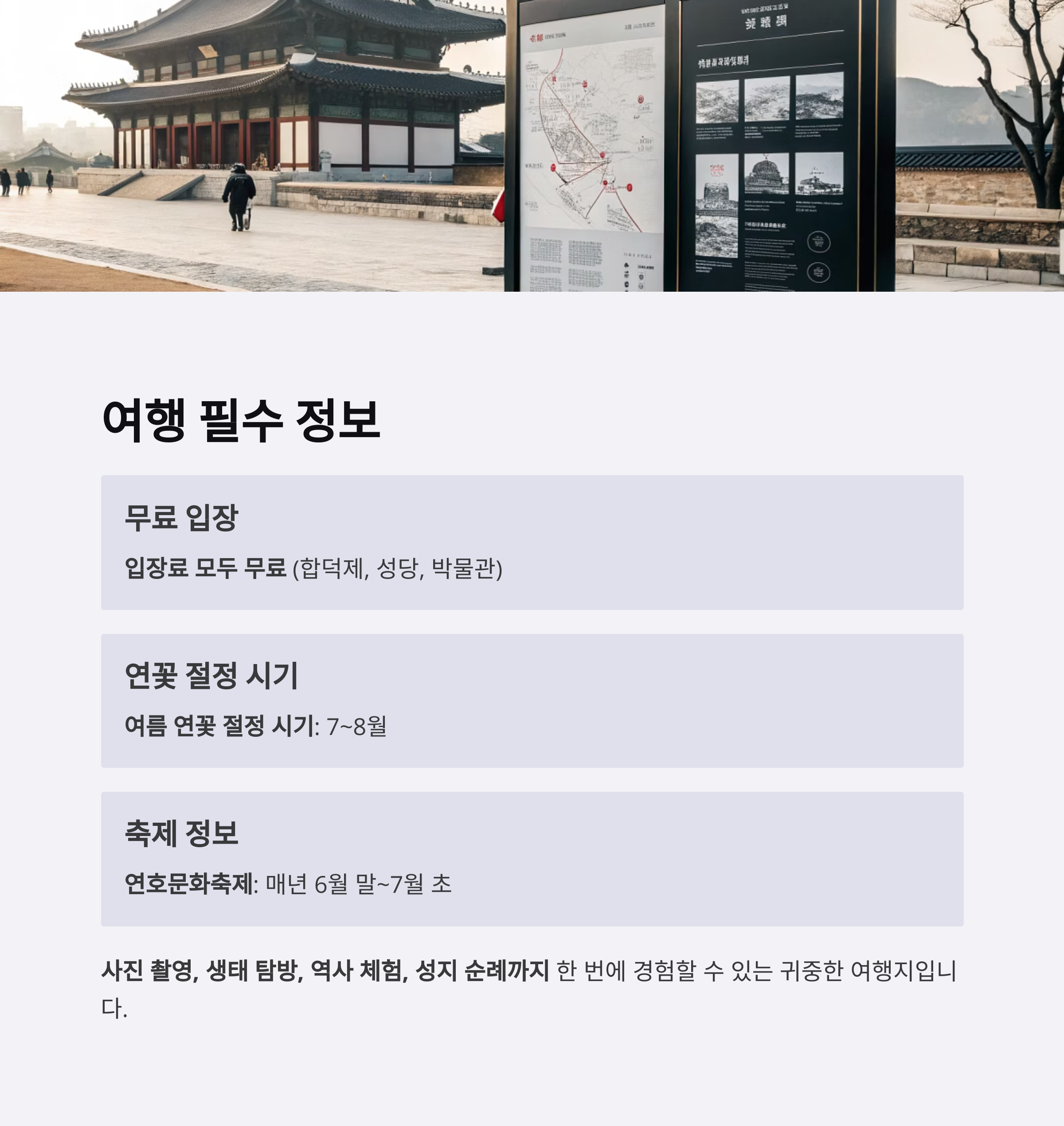 | 꽃 명소 | 연꽃, 벚꽃, 유채, 코스모스 | 7~8월 연꽃 절정 |