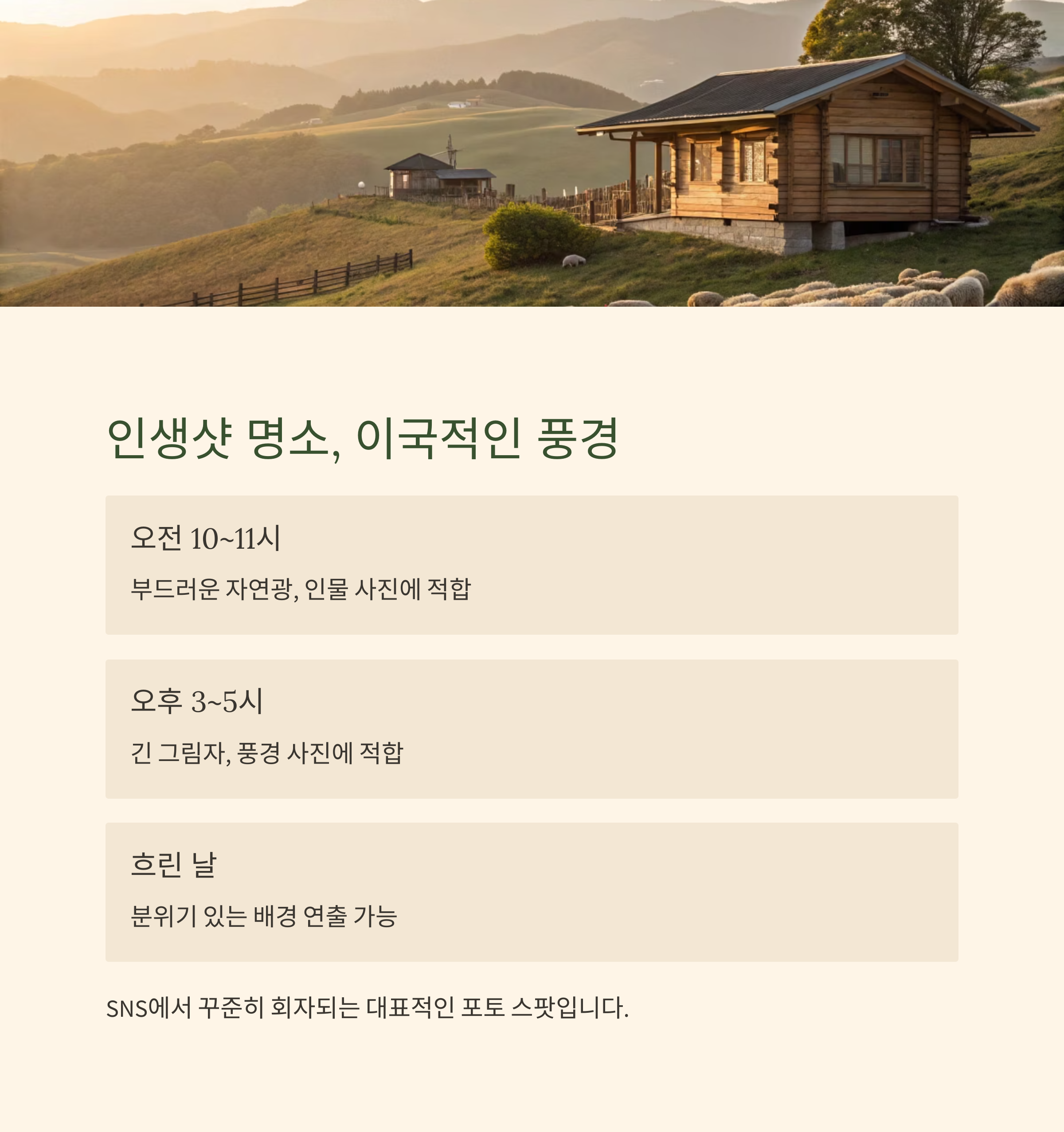 | 오후 3~5시 | 그림자 길고 풍경 사진에 적합 |