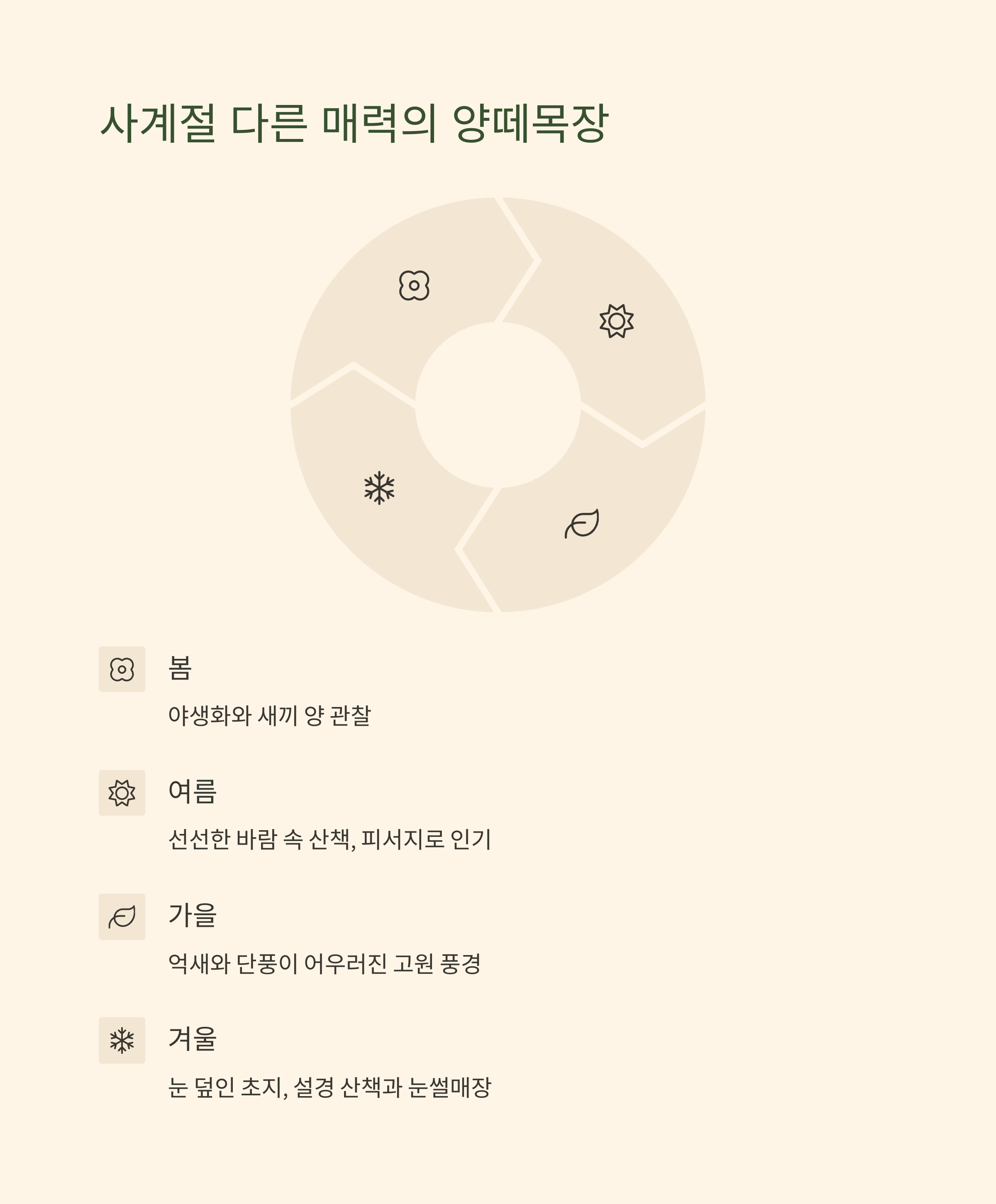 양떼목장은 사계절이 뚜렷해 언제 방문하든 새로운 매력을 선사합니다.