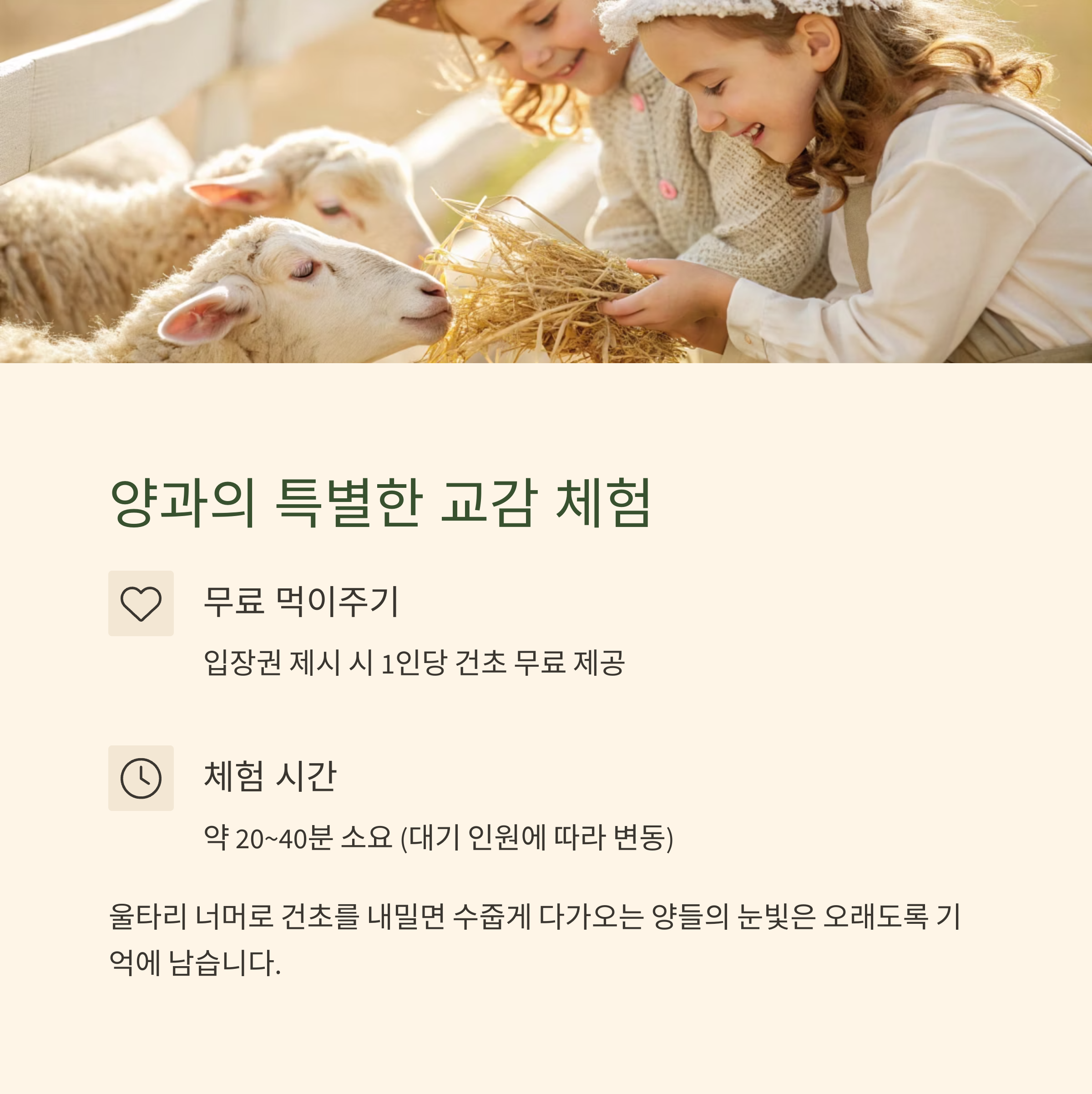 국내 체험형 목장 중 가장 많은 누적 방문객 수를 기록한 인기 장소입니다.