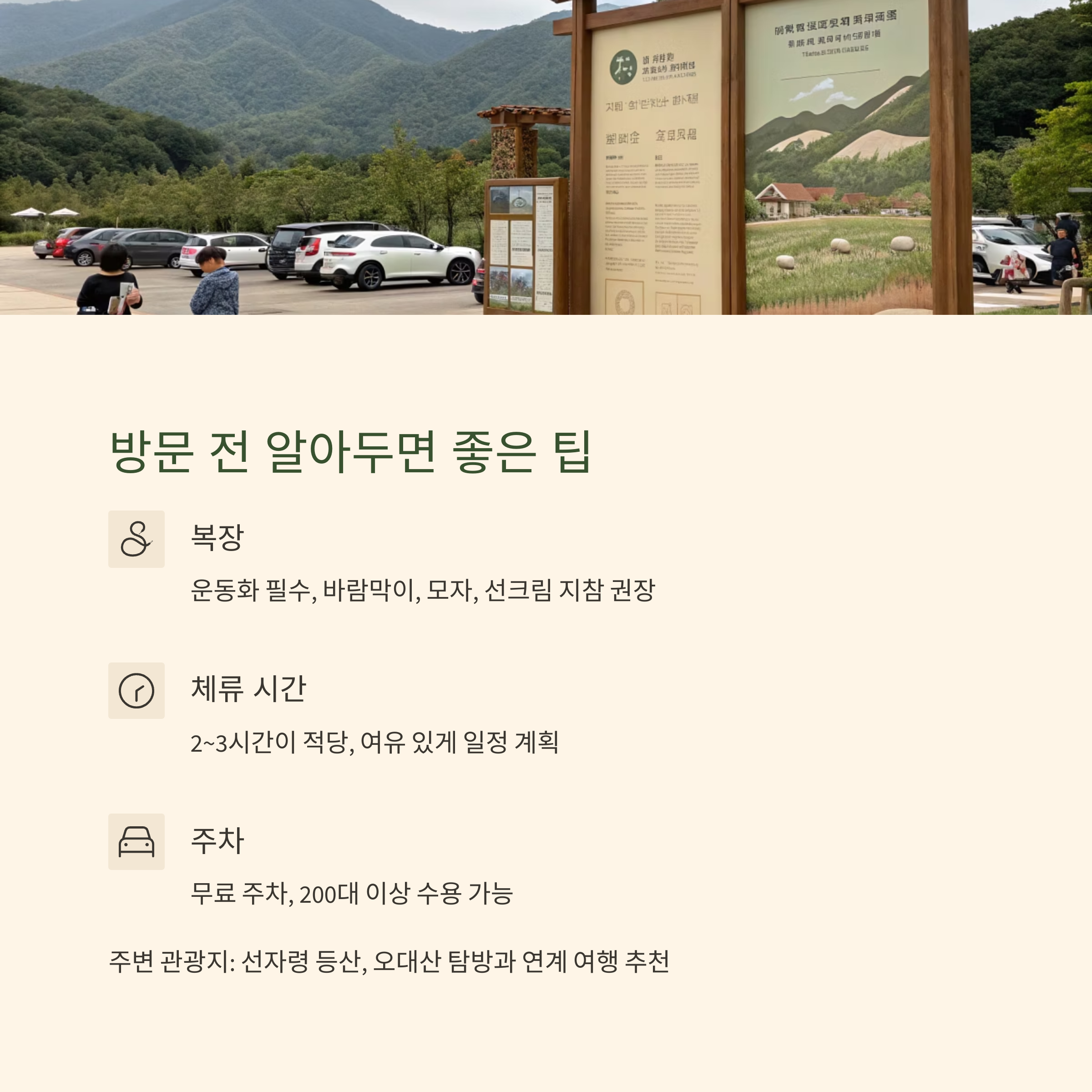 - 주변 관광지: 선자령 등산, 오대산 탐방과 연계 여행 추천