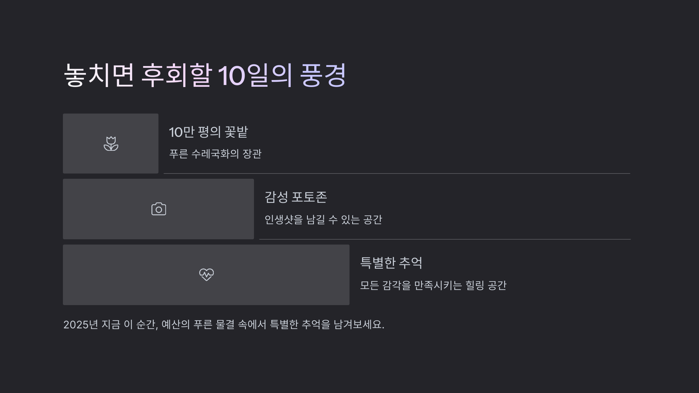 10만 평의 꽃밭, 감성 포토존, 동물과의 교감, 트랙터 열차까지