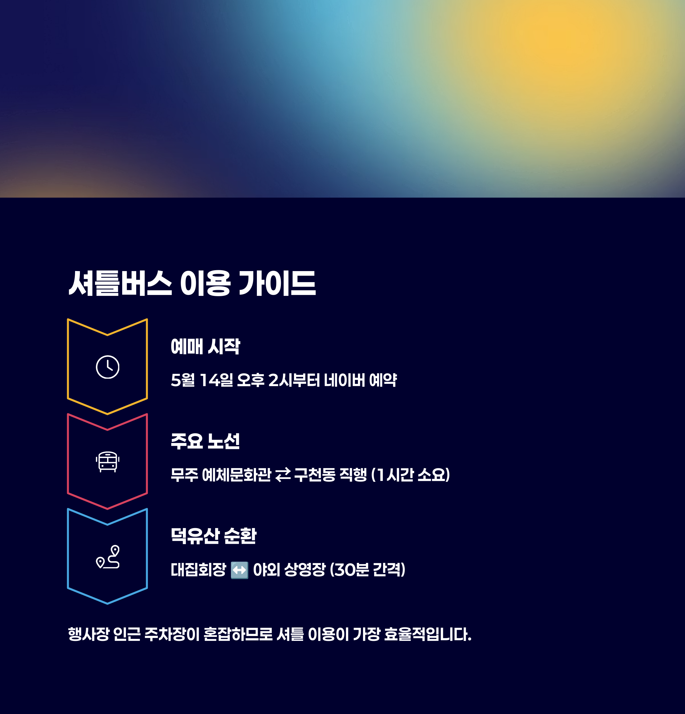 셔틀버스는 무주읍과 행사장, 덕유산, 숙소 구간을 연결하는 핵심 교통 수단입니다.