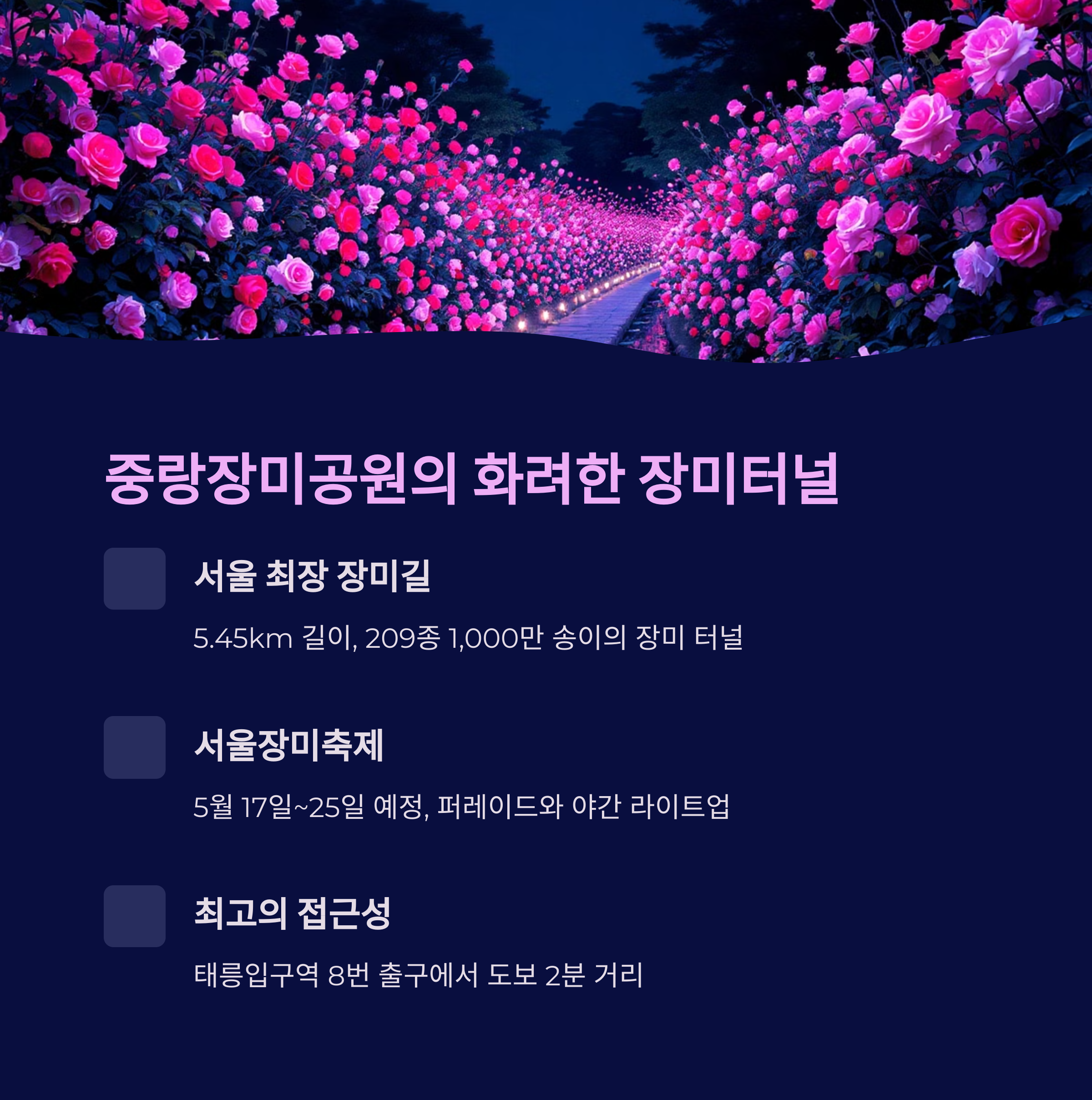 | 중랑장미공원 | 중랑구 묵동 중랑천변 | 209종 1,000만 송이, 5.45km | 서울장미축제, 야간 조명 | 태릉입구역, 인근 공영주차장 |