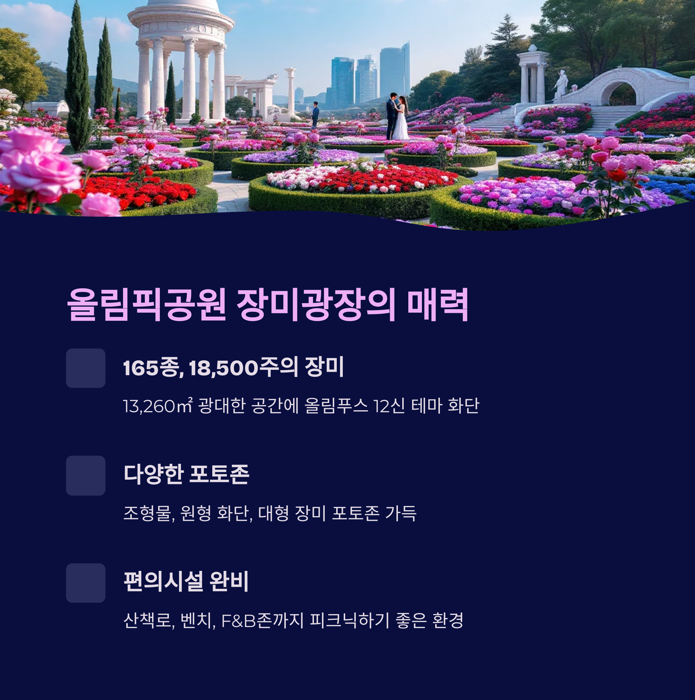 | 올림픽공원 장미광장 | 송파구 올림픽로 424 | 165종 18,500주, 12신 테마 | 로즈아워페스타, 포토존 | 방이역/올림픽공원역, 남2문 주차장 |