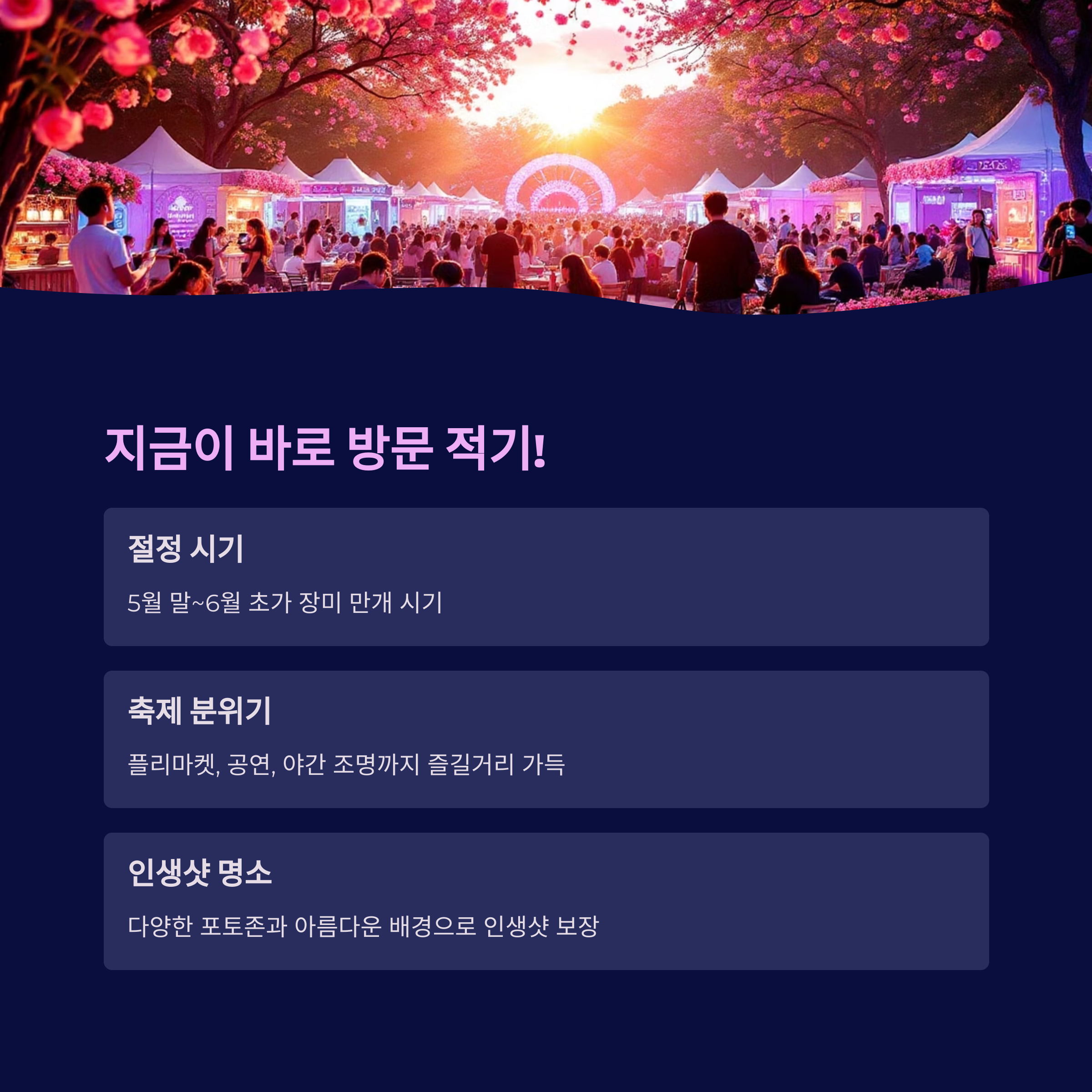 - 편의시설: 공영주차장, 포토존, 먹거리 등 잘 구비되어 있어요