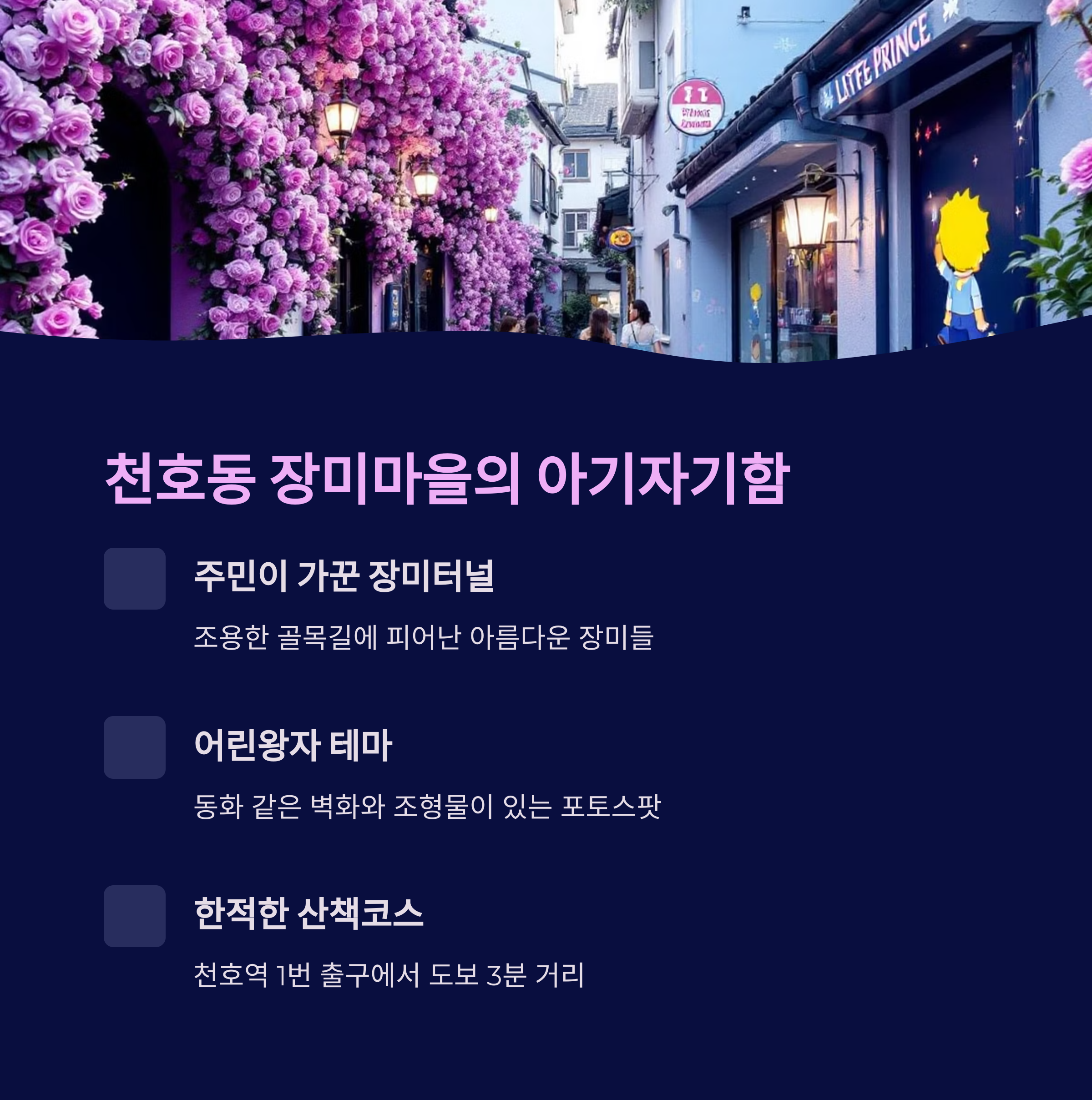 | 천호동 장미마을 | 강동구 천호동 | 주민가꾸기, 어린왕자 테마 | 벽화·조형물, 골목길 산책 | 천호역, 인근 공영주차장 |