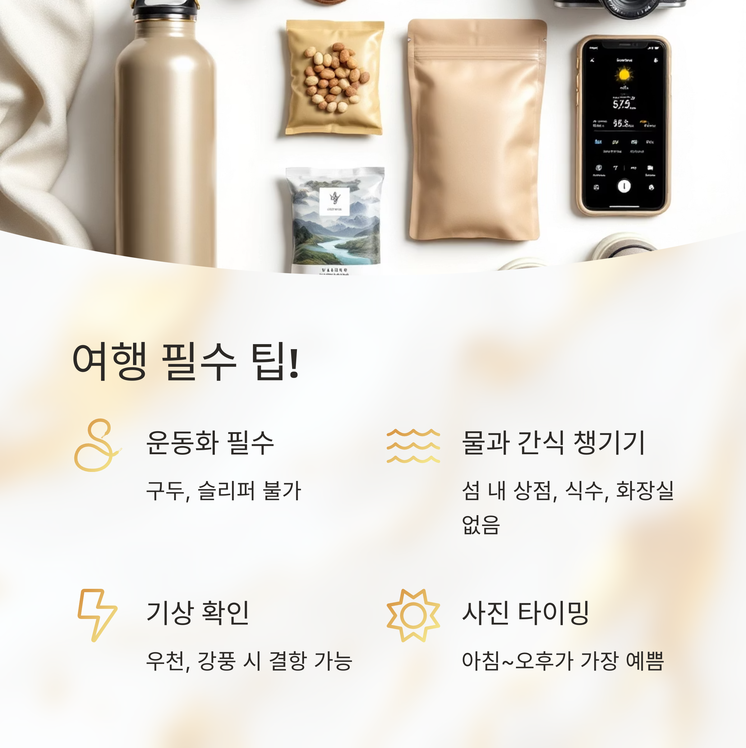 - 섬 내에는 상점, 식수, 화장실 없음 → 간식과 물 꼭 챙기기