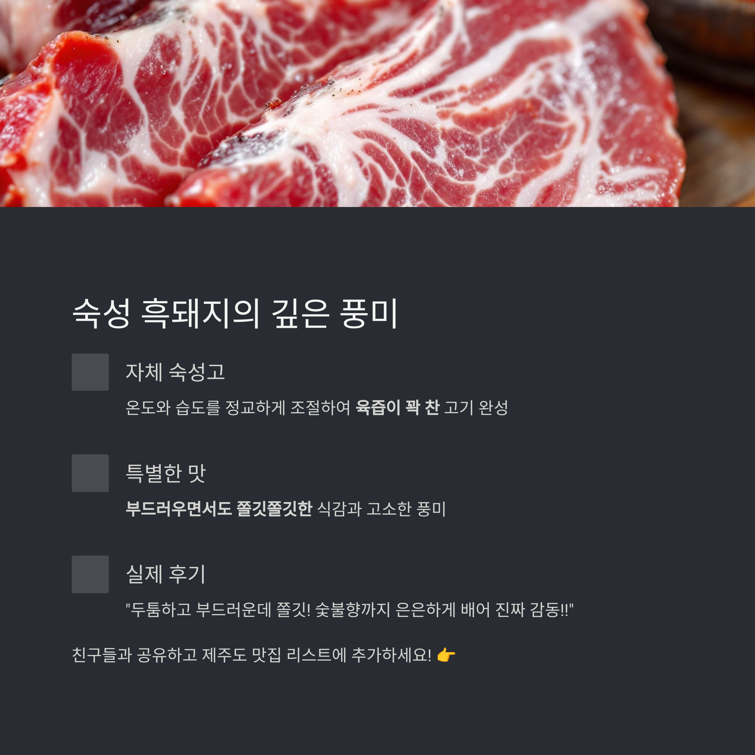 - 정교한 숙성으로 완성된 흑돼지의 깊은 맛