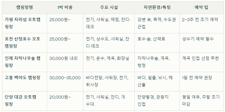 국내 가성비 캠핑장 TOP 5 한눈에 비교